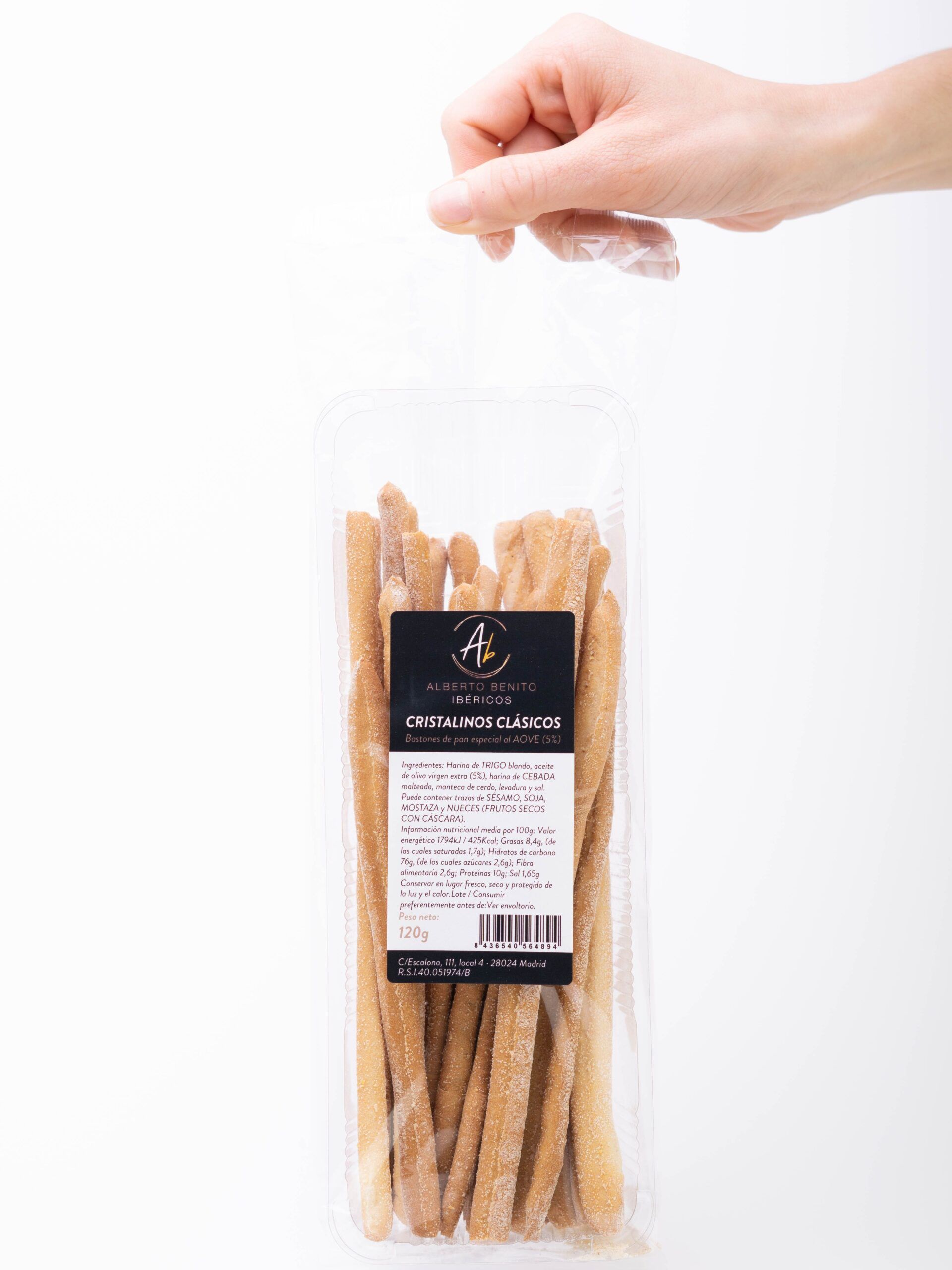 Cristalinos Clásicos 120g de Alberto Benito Ibéricos. Disfruta de estos crujientes palitos de pan elaborados con aceite de oliva virgen extra (AOVE). Los cristalinos clásicos se caracterizan por su textura ligera y crujiente, perfectos para acompañar todo tipo de aperitivos, como embutidos, quesos o patés.