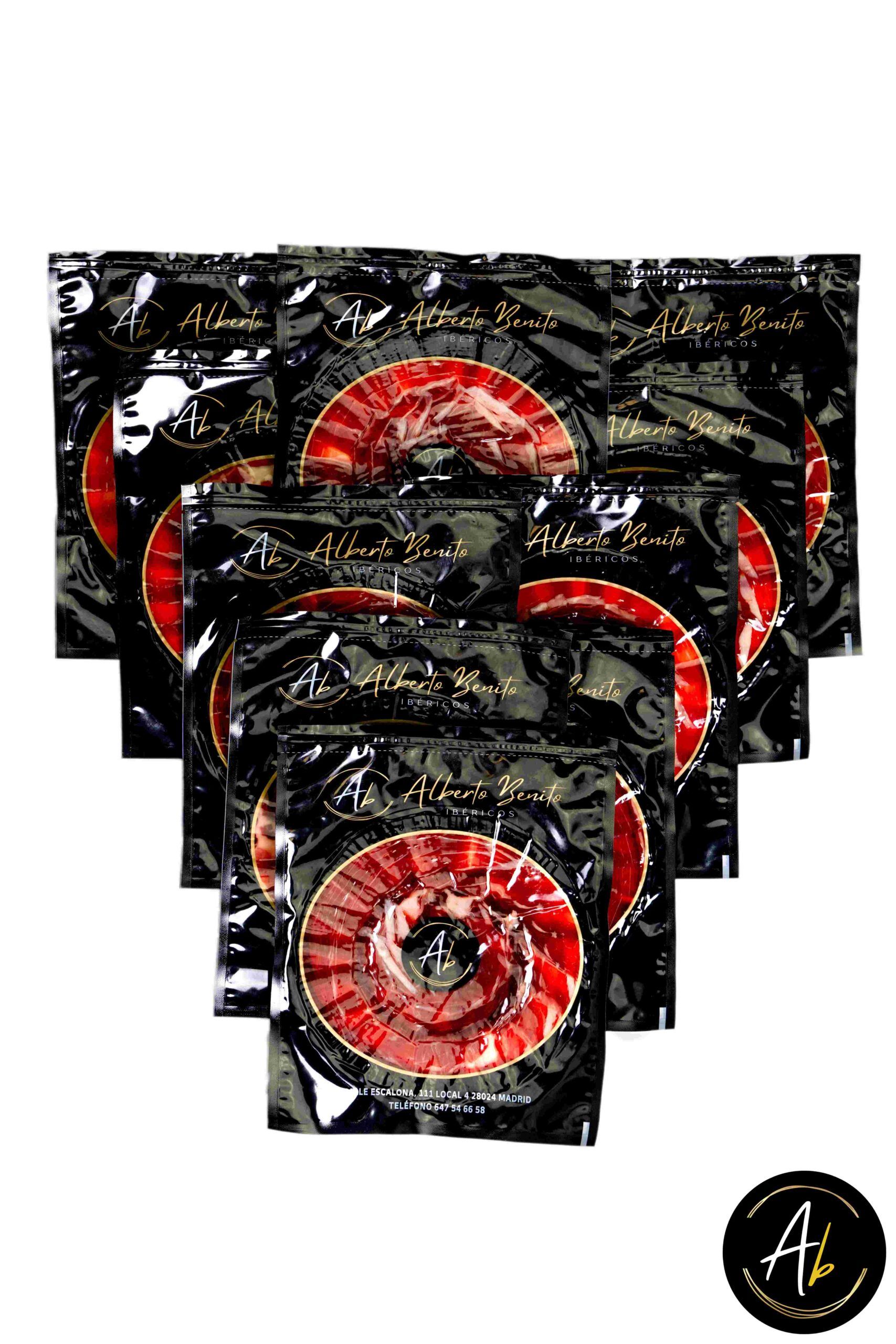 Pack de 10 sobres de Jamón de Cebo Ibérico 50% Raza Ibérica cortado a cuchillo. Este exclusivo pack contiene jamón de cebo ibérico, cuidadosamente seleccionado y cortado a cuchillo por expertos. Cada sobre está envasado al vacío para preservar el sabor, la textura y la calidad del producto.